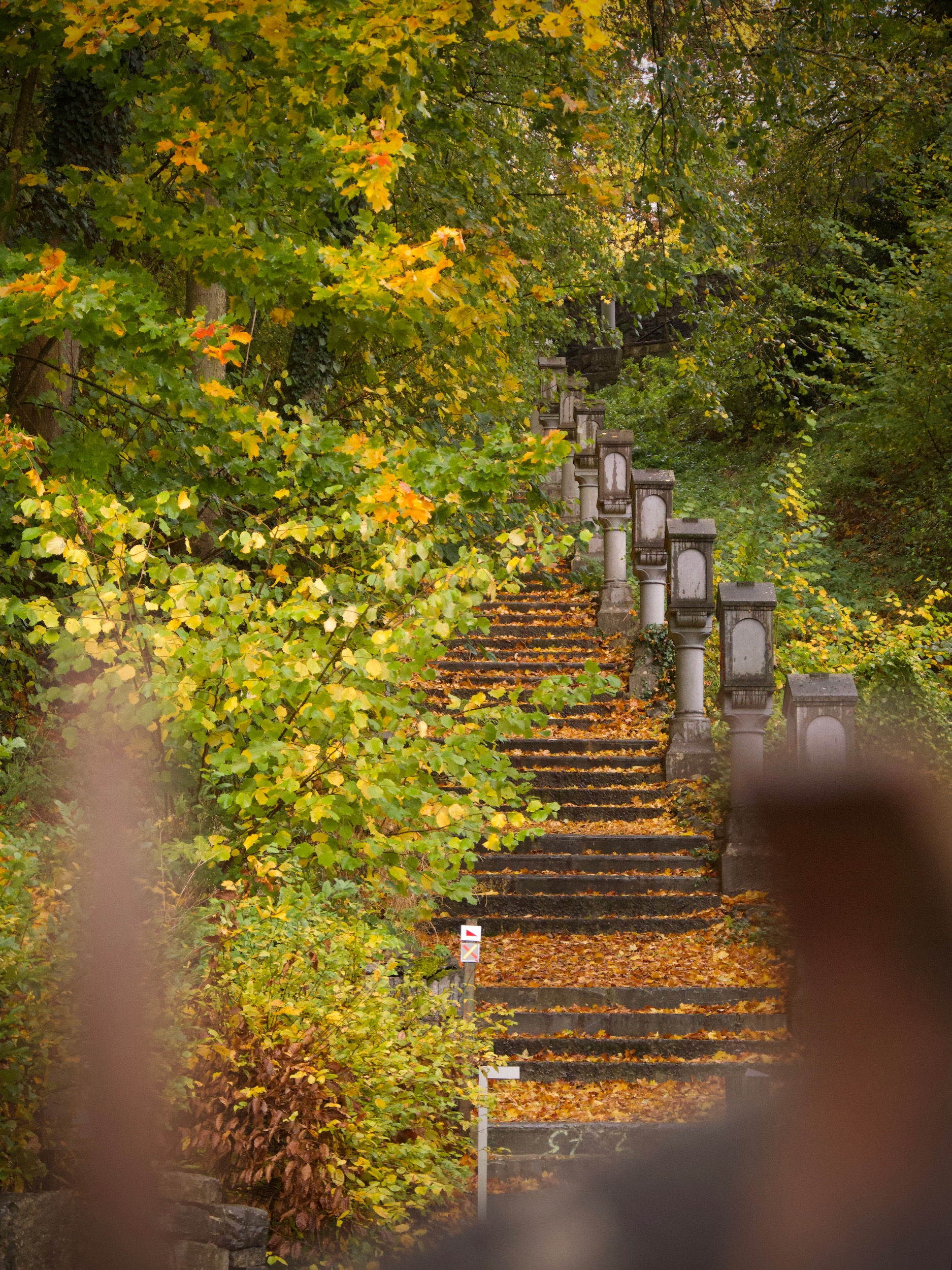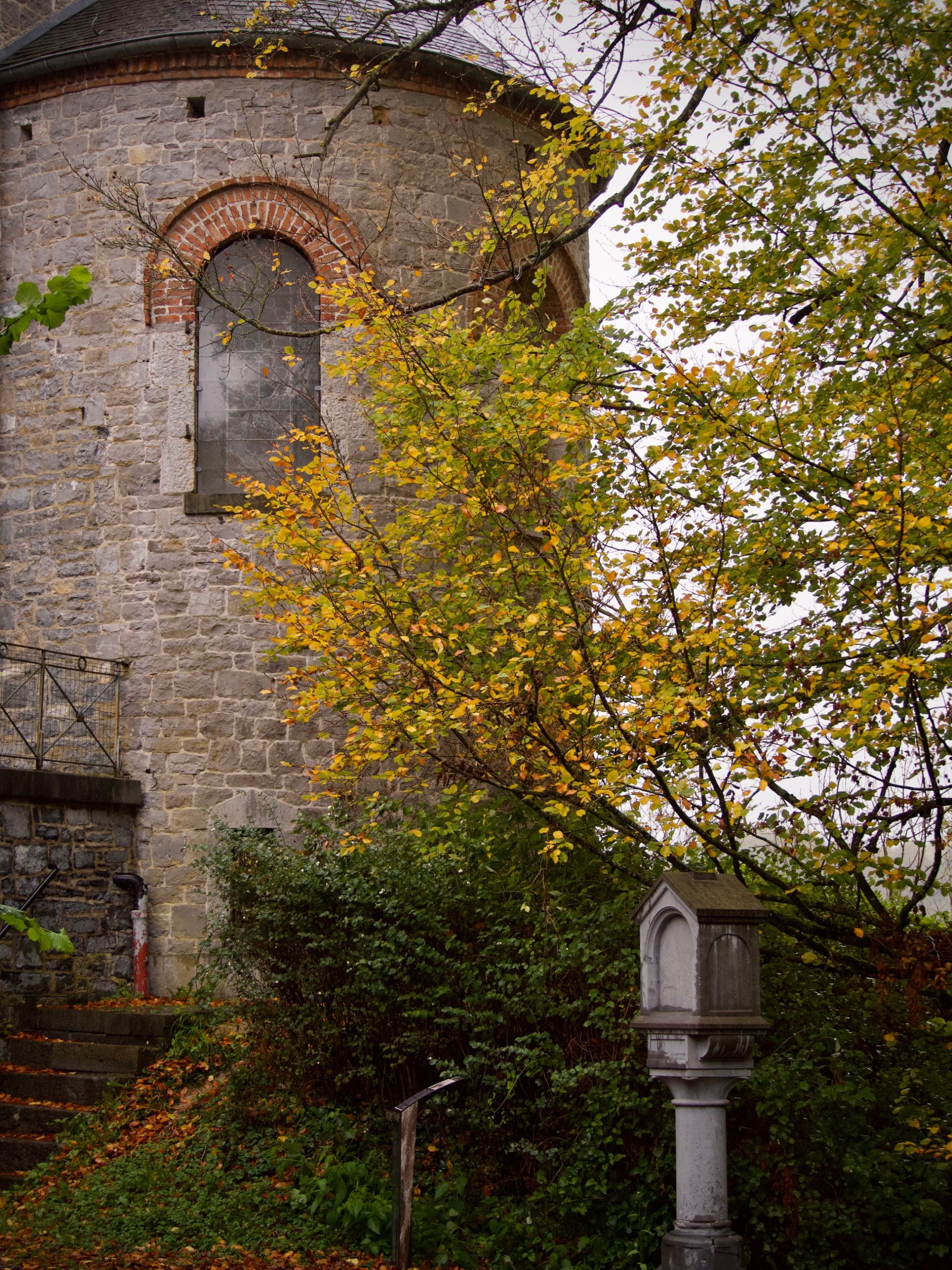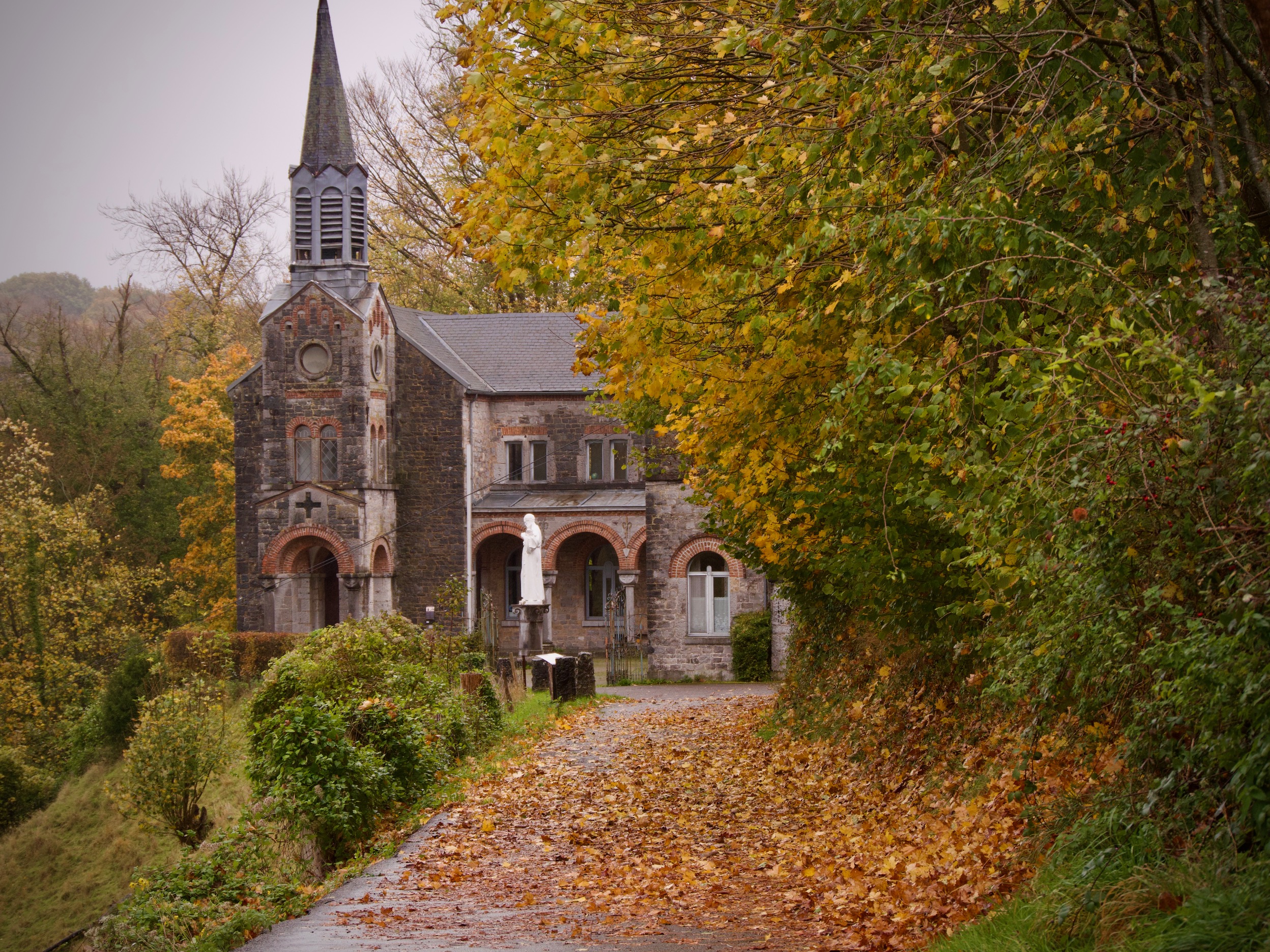 Wie zin heeft in een beetje beweging kan de trappen nemen, maar je kunt ook met de auto gaan. Er is een kleine parkeerplek voor het klooster. Zeker in de herfst en met de regen die ik trof, was het heel sfeervol om de trappen te nemen. Er waren bijna geen toeristen, dus ik had het klooster voor mijzelf. Het voordeel van regen. De mystieke herfstsfeer droeg voor mij bij aan het verhaal rondom Saint-Hadelin.