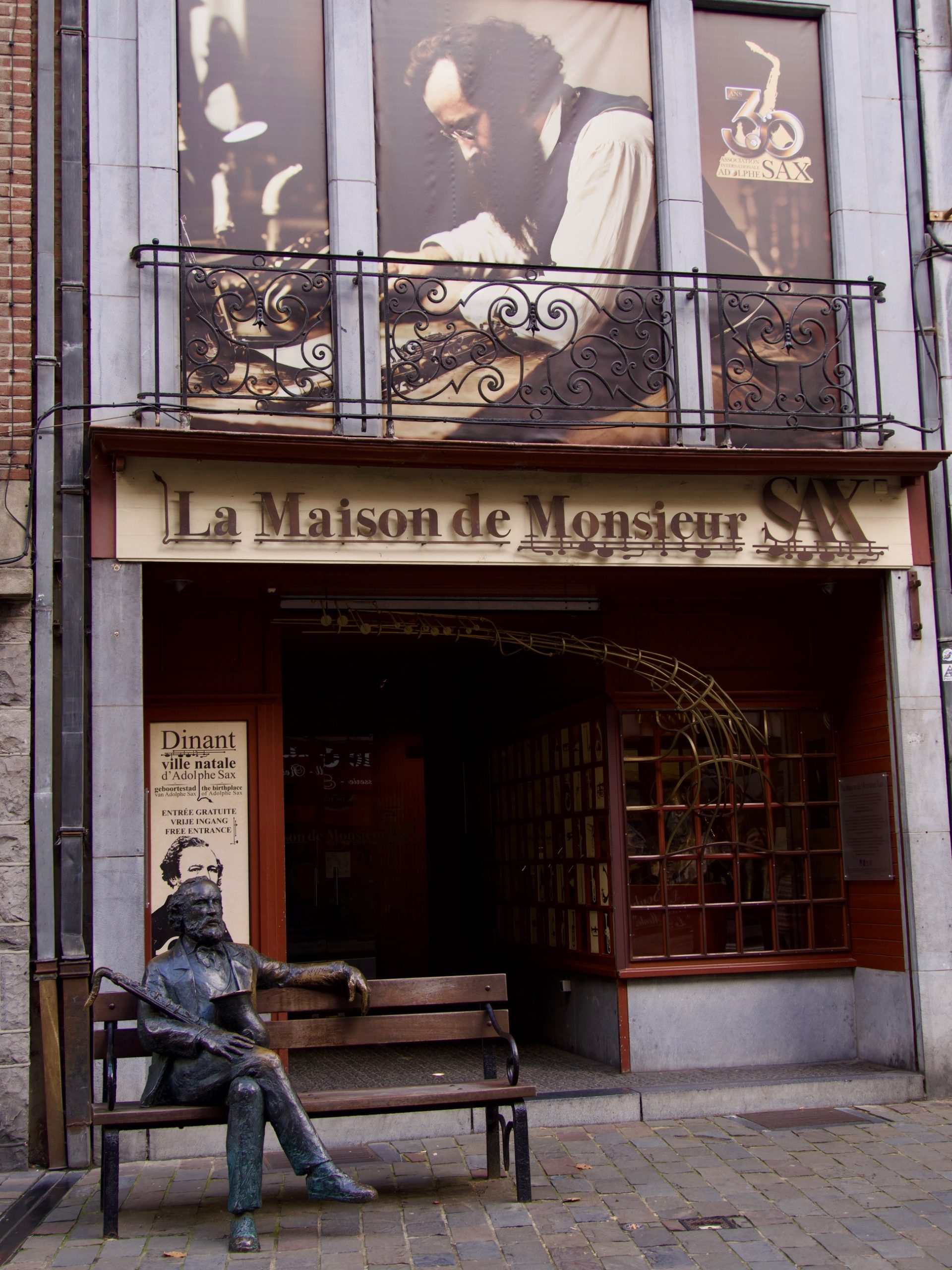 Aan de overkant van de brug, in de straat links van de kerk, vind je het Maison de Monsieur Sax, een klein gratis museum in het geboortehuis van Sax. Binnen hoor je zijn muziek, zie je oude instrumenten en krijg je een idee van zijn invloed op de muziekgeschiedenis. Een echt museum kun je het eigenlijk niet noemen, want het is er klein en onoverzichtelijk, maar even langslopen is wel grappig. Je kunt het niet missen, want voor het huis staat een bronzen beeld van een bakje met meneer Sas himself. Leuk om even naast hem te gaan zitten voor een foto.