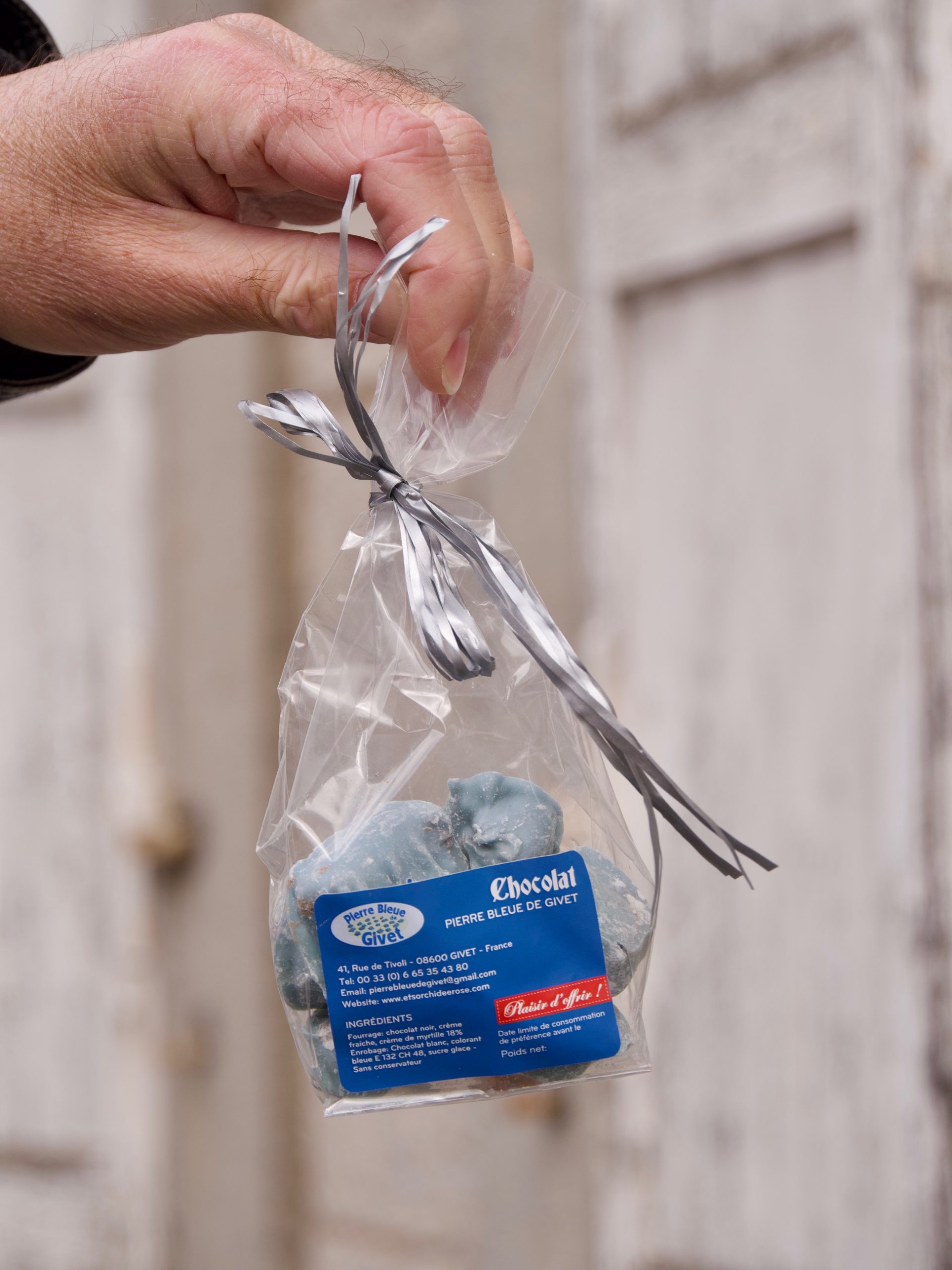 Een lokale specialiteit is de Pierre Bleue de Givet, een blauwe bonbon met een heerlijke bruine vulling. De kleur verwijst naar het blauwe leisteen dat in de omgeving wordt gewonnen. De bonbon bestaat al een eeuw en werd oorspronkelijk als medicinale zoetigheid verkocht. Wij kochten ze bij Porcelli S-jf Sarl, 47 Rue Notre Dame.